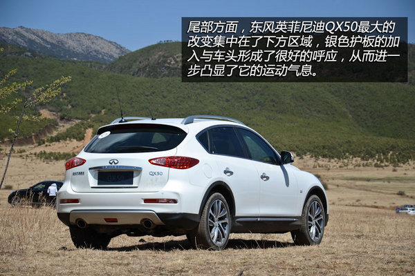 相比进口QX50来说,这次国产后的QX50在外观设计上显然要更大胆了一些,如果说进口QX50一直以一副素颜面向世人的话,那么国产之后它,显然更加精心的梳洗打扮了一番,显得更加容光焕发。黑色仿水波纹的进气格栅,相比进口车型的银色横幅进气格栅来说更加的年轻动感,银色装饰条采用的消光处理也恰到好处,同时保险杠也有着巨大变化,除中央进气口尺寸更大之外,两侧的雾灯造型也进行了彻底的改变,LED日行灯与封闭式进气格栅装饰板的加入,起到了重要的点睛作用。