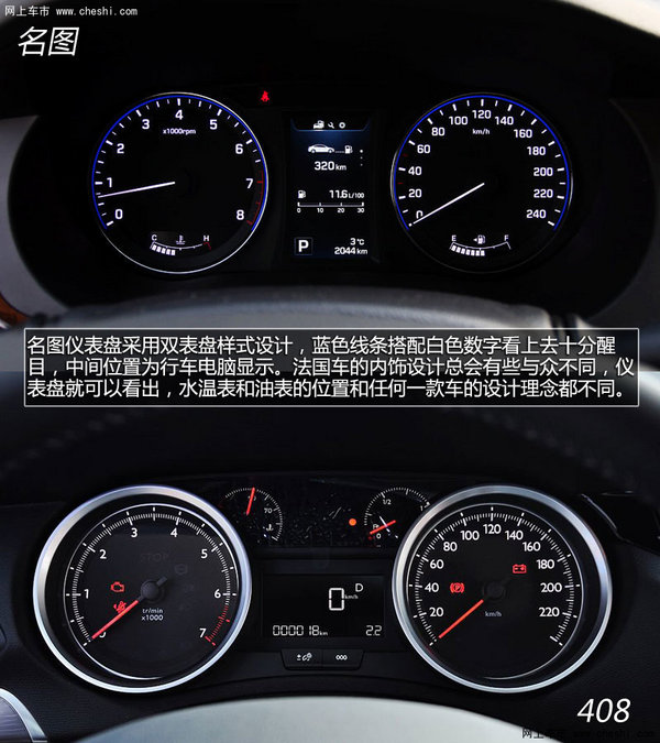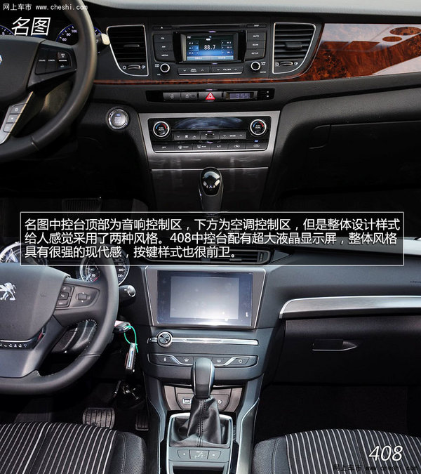 名图方向盘多动能按键看上去很有质感,仪表盘采用双表盘样式设计,蓝色线条搭配白色字体看上去十分醒目,中控台上方配有桃木样式下方却显得很有科技感。408方向盘采用真皮包裹,方向盘中间位置设计看上去很上档次。中控台配有超大液晶显示屏,具有一定现代感。