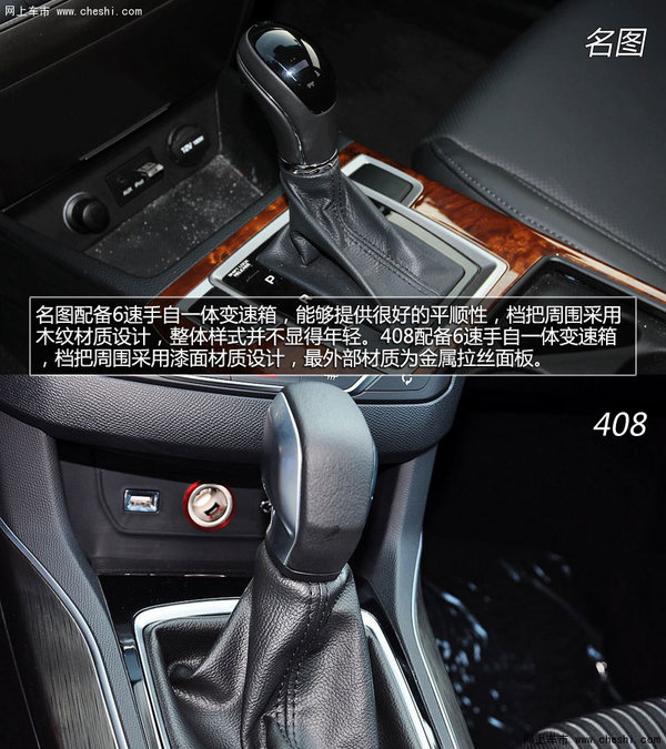 名图内饰采用全黑颜色搭配,中间位置木纹材质虽然很上档次,但是内饰却缺乏了一定的科技感,给人感觉和外观有些不符,而408内饰依然采用全黑颜色搭配。两款车内饰配置都很全面,名图配备了全景天窗、座椅真皮包裹和单碟CD。而408增加了真皮方向盘、后排座椅比例放倒、单碟DVD和蓝牙/车载电话系统。