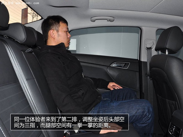名图内饰座椅采用真皮包裹,座椅材质看上去十分细腻,并且乘坐上去也很柔软。而408车内座椅采用织布材质,虽然没有皮质看着上档次,但是黑色条纹面料却显得运动感十足。为了测试两款车乘坐空间我们请来两名身高均为175cm的体验者来到来个款车内,名图体验者前排头部空间为四指,而408体验者前排头部空间为一拳的距离。