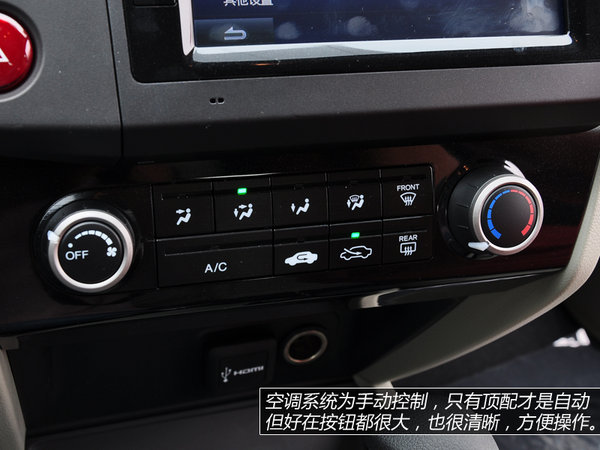 中控区域并非对称式设计,这或许会成为一部分消费者拒绝它的理由,中央的彩页液晶屏不具备导航功能,颇为遗憾。空调系统为手动控制,只有顶配才是自动,但好在按钮都很大,也很清晰,方便操作。