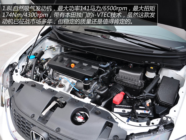 1.8L自然吸气发动机,最大功率141马力/6500rpm,最大扭矩174Nm/4300rpm,带有本田独门的i-VTEC技术,虽然这款发动机已征战市场多年,但稳定的质量还是值得肯定的。5速自动变速器也是老面孔了,在6/7/8甚至9速满天飞的时代似乎不够与时俱进,但它与发动机配合默契,动力发挥不输对手,日常使用还能够满足要求。思域采用的是前麦弗逊后双横臂式独立悬架,操控性及舒适性表现都不错。