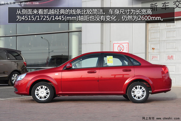 在进气格栅的造型上,凯越保持老款直瀑式经典造型,但相比老款变得更富有立体感,同时,将原先位于车标上部的折线进行了下移。凯越经典长宽高仍为4515/1725/1445(mm)轴距也没有变化,仍然为2600mm。