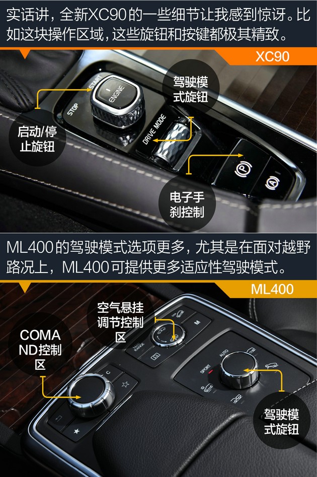 花100万元买台车内饰太“陋”能成吗?当然不行!应该说这两台车坐进去就感到逼格相当高。全新XC90这次实现了对ABB的逆袭,内饰用料和做工都相当高大上,细到按键和旋钮都相当精致,如同是工业模式下散发的艺术品气息。而ML400是天生的豪华,原因无它,因为ML400生长在奔驰家族。全新XC90显得年轻一些,ML400则更有经典的味道。