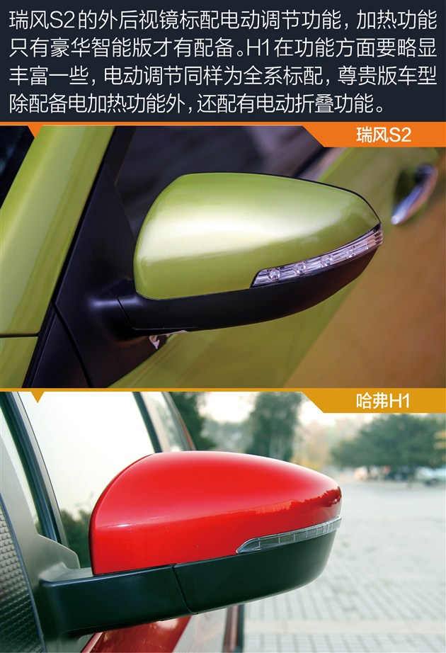 H1因全系标配了前雾灯、日间行车灯、后驻车雷达(瑞风S2最低配的舒适版未配备),顶配车型多出了外后视镜电动折叠功能,在外部配置方面稍有优势。