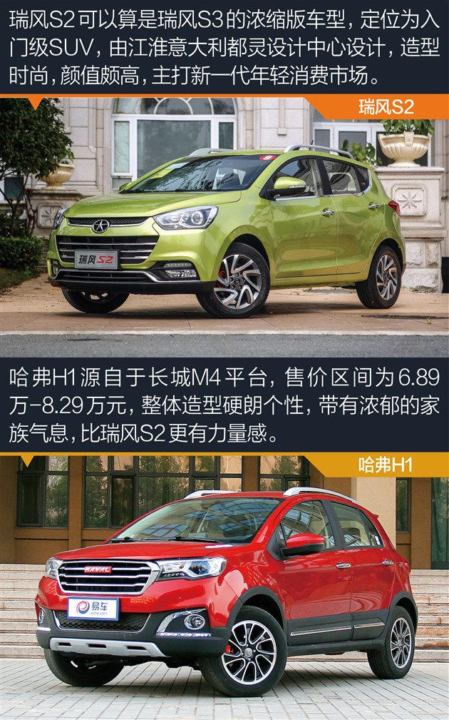 江淮首款小型SUV瑞风S3上市后受到了满堂喝彩,销售成绩也令人欣喜。近期,江淮汽车又趁热打铁推出了一款入门级SUV——瑞风S2,新车采用了比S3更加精致的外观设计,并沿用了S3的动力总成。细数同级别车型,目前与江淮一样在同一细分市场完成双车型战略布局的就只有哈弗了(H1和H2),而H1正是S2的直接竞争对手,谁能够“满足”你?我们一起来寻求答案。