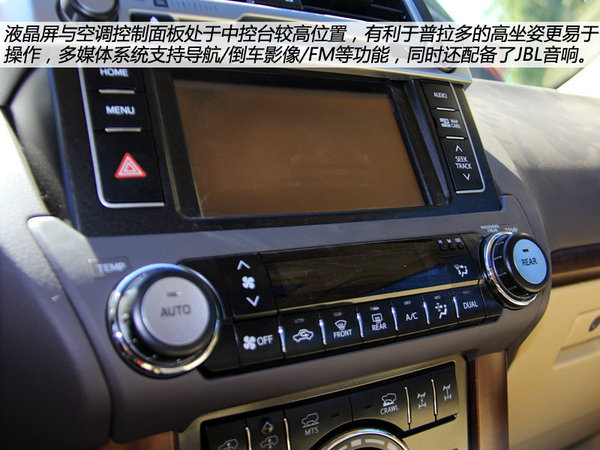虽然普拉多也采用了炮筒式的仪表设计,但简洁务实的风格让你找不到半点儿运动感,务实风格向来是丰田的追求,这样挺好。7寸的中控屏对于普拉多来说尺寸略显小,但其提供了导航,蓝牙,G-Book等功能,这款高配车还装备了14扬声器的JBL音响。