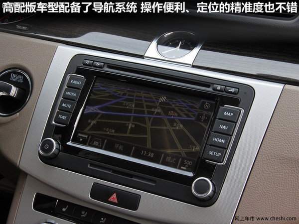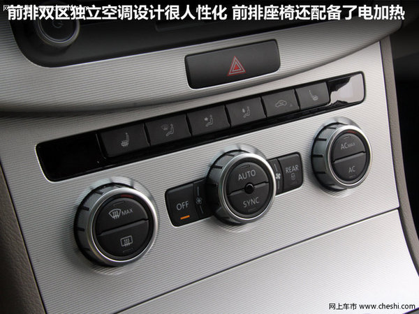 全新迈腾顶配版的中控台主功能区深色的木纹装饰虽然已经不是欧版的金属风格,但并不庸俗。时钟被设计在了出风口的下方也并不显得突兀。下方的银色中控部分却又浑然一体且区域划分明显,这样大胆且成功的设计也很令我们惊喜。
