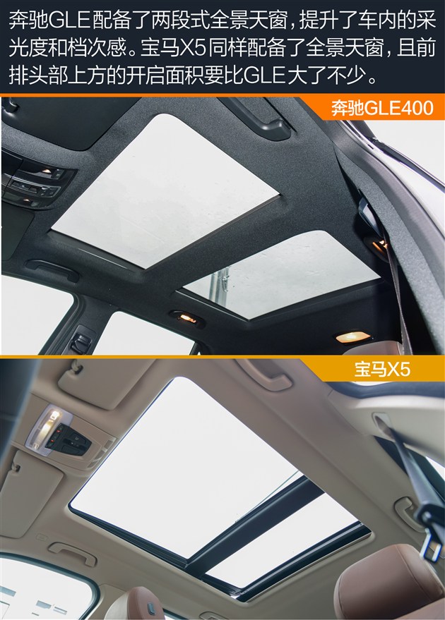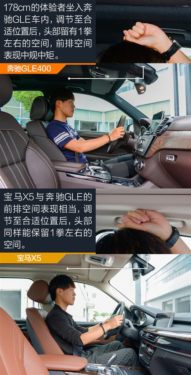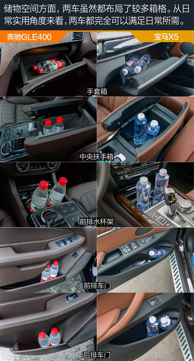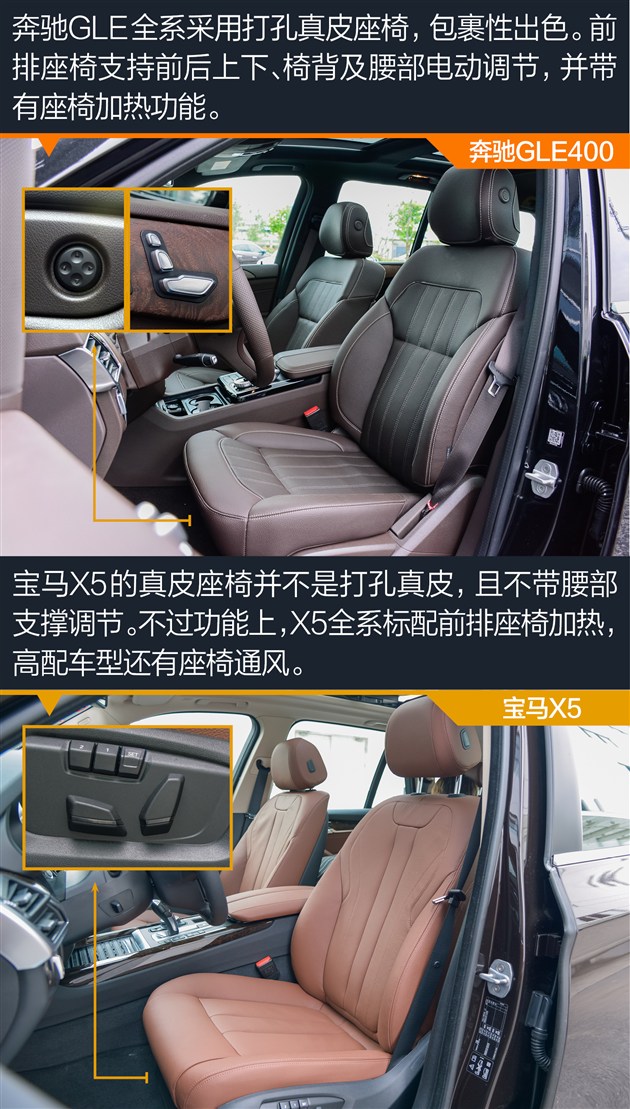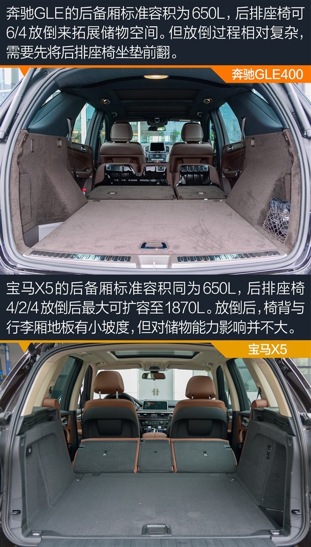 空间小结:奔驰GLE和宝马X5在乘坐空间的表现基本相同,后备厢的容积也不分伯仲,两者都拥有较大行李厢,并且后排座椅可以完全放倒以实现大件物品的摆放,只是在后排放倒的操作方面,奔驰GLE要稍繁琐一些。值得一提的是奔驰GLE的驾驶座座椅电动调节比宝马X5多了腰部支撑,长途驾驶更为有用,不过在后排乘坐方面,X5较低的中央通道高度,使得后排乘坐三人时比GLE更舒适自如。