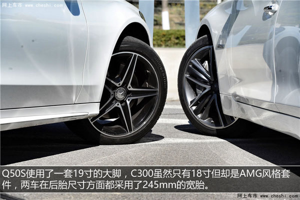两车的轮圈Q50S使用了一套19寸的大脚,而C300只有18寸,两车在后胎尺寸方面都采用了245mm的宽胎。从车尾来看,Q50S不如车头激进,与普通版的Q50没有太大区别,C300的车尾后港下方设计有黑色的扩散器,看起来要激进不少。