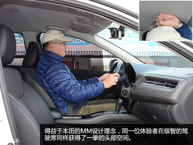 尽管身材不占优势,但本田的MM设计理念(机械空间最小化,乘坐空间最大化)依然赋予了缤智宽敞舒适的空间感受。同样以我的同事石嵩为例,前排驾驶席的头部空间仍为一拳。在后排,乘坐者的膝部与前排座椅靠背间同样可以轻松摆放体验着的双拳。只是头顶空间略显压抑,仅有一指余量。