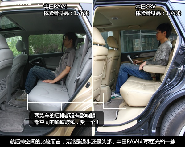 从我们两位身材相仿的体验者在车内的空间展示就能看出。它们都很舒适,这很重要!但很显然RAV4的体验者拥有更充裕的活动空间,包括头部与腿部!这一现象如果换做身材更魁梧的人来进行展示将得到放大。你会发现,185cm的人做进RAV4的车内仍然不会感到拥挤,而CRV则不能提供这种待遇。另外它们两者有一个共同特点:车后座的地板都没有鼓起的排气通道,这是SUV的一大优势,坐在车内的成员再也不会感到局促。左右移动也便捷了许多。