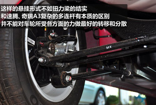 最后我们要比较一下两款车的底盘悬挂。前悬挂都是常见的麦弗逊式独立悬挂,而后悬挂的区别比较明显。赛拉图的后悬挂和别克凯越的相似,独立式的结构允许左右后轮间存在更大的高度差,因此在操控性和舒适性的表现上要更好一些,但承载能力上肯定不如扭力梁式后悬挂,而福瑞迪使用的正是扭力梁式。