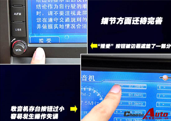 至于舒适性配置,S30算是实惠到家了!除了配置了电动天窗以外,最大的亮点是配备了DVD导航系统,这样的高成本装备能够出现在一辆不足10万元的小车身上,确实不多见。整套系统可以触摸操控,界面友好大方,操作起来很容易上手,只是在细节方面有些小毛病,比如存储FM频道时,按键过小,很容易产生误操作等等,这点S30还有提升的空间,加油!