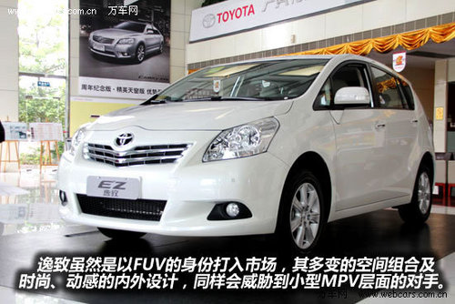广汽丰田逸致是一款定位于FUV(Fashionable Utility Vehicle )的全新车款,他集MPV、三厢轿车、SUV等车型特点为一体的全新设计,可以满足不同消费层面的需求,与很多紧凑级MPV一样,逸致也是基于现有的轿车平台开发出来的一款全新变种车型,采用与卡罗拉相同的平台,但在外观上除去丰田家族的特色面谱外,很难在逸致身上找到现有卡罗拉的相似之处,不难看出,厂方并不像让逸致有太多“卡罗拉”的元素,更希望大家把逸致当做是全新概念的车款罢了。
