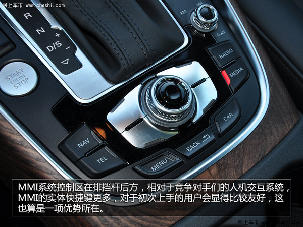 Q5全系标配了自动大灯,可在感应到环境变暗时自动开启大灯,此外,仪表亮度也可以单独调节,防止夜间跑长途的时候仪表背光给人眼造成视觉疲劳。MMI系统的功能十分强大,可设置并查看车辆信息,而且还带有导航和多媒体播放等功能,屏幕分辨率比较高,充足的亮度使得其在阳光下也能保证使用。系统控制区在排挡杆后方,相对于竞争对手们的人机交互系统,MMI的实体快捷键更多,对于初次上手的用户会显得比较友好,这也算是一项优势所在。