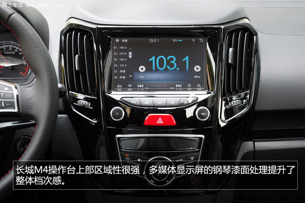 配置上,长城M4的三款自动挡车型亮点在于全系标配ESP电子车身稳定系统,其余配置则和三款手动挡车型保持一致,标配日间行车灯、16英寸轮圈、真皮方向盘、倒车雷达;除最低配的舒适型之外,其余车型还额外配备有8英寸液晶屏、导航、倒车影像;顶配的精英型则配备有电动天窗、自动空调、前排座椅加热、外后视镜电加热、坡道起步辅助等。