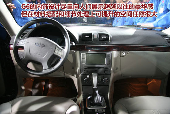 在G6的内部,这款车所展现的豪华实力还是颇让我们惊叹的,全车座椅和内饰基本上都使用了真皮包裹,仪表台表面皮质也被特殊处理,不会因阳光照射而产生反光等影响驾驶安全。外后视镜电动调节被设计在不用低头便可边观察边进行调节的前车窗内夹角处,相当人性化。