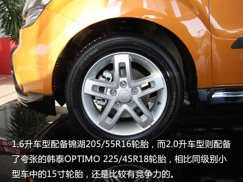 轮胎方面,1.6升车型配备锦湖205/55R16轮胎,而2.0升车型则配备了夸张的韩泰OPTIMO 225/45R18轮胎,相比同级别小型车中的15寸轮胎,还是比较有竞争力的。
