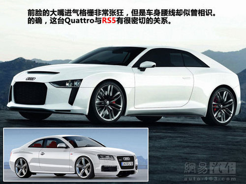 而今这款概念车也与其前辈有相似之处。这款概念车的车身和底盘都是基于奥迪RS5打造,就连车身腰线都非常的相似。但Quattro概念车绝非徒有其表,奥迪工程师同时赋予了它不俗的硬件条件,以求与它的名称和张扬外表相符合。