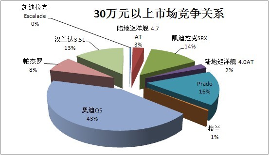 去年Q5毋庸置疑地成为该细分市场最耀眼的明星,销量达到58452辆,大大超过上年的32557辆;在该细分市场的份额从上年的35.8%进一步上升至43.13%,继续领跑30万元以上市场;上年位居其次的汉兰达3.5让位于普拉多,普拉多的市场份额达到16.14%;上年的第三名从普拉多让位于凯迪拉克SRX,凯迪拉克占该细分市场的比重从上年的10.11%上升为13.56%。奥迪Q5以2.0TFSI发动机、全时四驱技术、轻量化技术、底盘一体化技术赢得了消费者的青睐,在传统汽车中,如此的技术集成可谓登峰造极,令其对手望尘莫及。尽管奥迪Q5因为价格而使大多数SUV爱好者望而却步,但与其竞品对比价格,其价格并不算高。这就不难理解为什么奥迪Q5能够占据如此的市场份额了,当然更值得注意的是,奥迪Q5指出了传统SUV的技术方向。