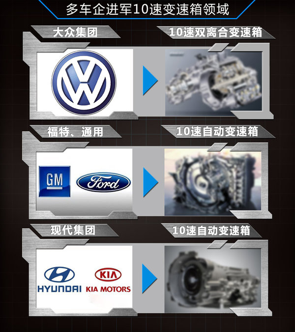 在如今的市场中,各大厂商均在开发更加高效的变速箱技术。在大众宣布生产10速双离合变速箱的同时,其竞争对手也纷纷将目标锁定在这一领域。在去年4月,通用和福特签署协议,双方将联合开发新系列节油传动系统,这其中包括9速和10速变速箱。根据计划,预计到2018年通用和福特合作开发的9速/10速变速箱年产能将有望各自达到100万台。此外现代起亚集团也宣布研发一款十速变速器,并有望在2015年开始搭载于现有车型上。随着变速箱技术的不断提升,未来各大产生在变速箱领域的竞争将更加激烈。