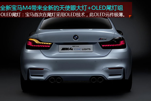 全新宝马M4概念车外观采用了白色金属漆,尾部采用了OLED技术尾灯组,在有机材料构成的极薄半导层中生成光线。这是首次在转向信号灯和尾灯上应用此项技术。发光表面的布置颇具立体感, 同时由于OLED元件极薄,占用的空间也极小。并且OLED的元素只有1.4mm薄。