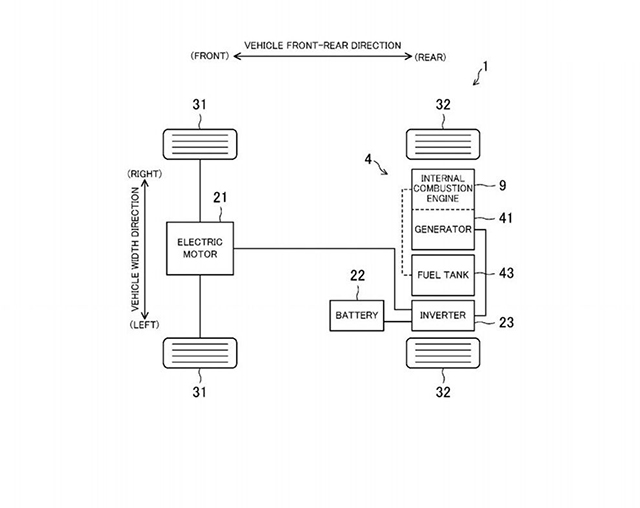 据专利图显示,该混动系统前桥配备一台电动机,电池位于底盘中间位置。而内燃机、发电机、油箱及逆变器则被布置在了后桥位置,而专利图中零件编号为9的内燃机显然是一台转子引擎。据悉,该转子引擎的作用是在电池组电量不足时,转子引擎将点火运转、带动发电机发电,电能通过逆变器输入电池组,实现为电池组充电的目的。