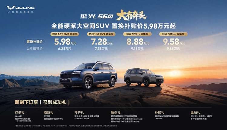 1月15日,上汽通用五菱旗下全新SUV车型——星光560正式宣布上市。新车共推出四款配置,涵盖燃油、插混与纯电三种动力形式,官方指导价为6.28万至9.88万元,置换补贴后价格为5.98万至9.58万元。提供三种动力系统星光560提供三种动力系统。燃油版搭载1.5T发动机,最大功率130千瓦,峰值扭矩290牛·米,匹配6速手动或CVT无级变速箱。WLTC综合油耗6.99或7.58升/百公里。插电混动版采用1.5升发动机与电机组成的混动系统,配备容量为20.5千瓦时的磷酸铁锂电池,CLTC纯电续航125公里,WLTC亏电油耗为5.3升/100公里,综合续航里程可达1100公里。纯电版搭载最大功率
