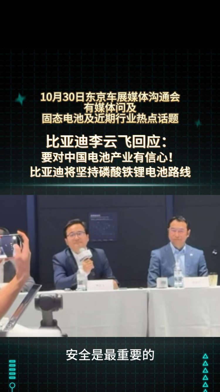 近期,关于电池路线的讨论,再次引发行业关注。在东京车展的一场沟通会上,有人问及电池行业相关热点话题,比亚迪李云飞给出了自己的观点——比亚迪将坚守技术核心优势,坚持磷酸铁锂电池路线。他表示,希望大家对中国的动力电池产业界要有信心。因为中国在这个领域本身就发展得最快,发展最好,有体量又有资源又有研发。虽然固态电池相比现有的电池有很多优点。但现有的电池方案有非常大的基础,现有的充电配套设施也很全面,装载以后也完全能够满足使用需求。包括冬季电池的保温技术也越来越好。过去几年,每一次网上因为各种原因发生的非磷酸铁锂恶性电动车燃烧事故,都会让消费者会认为电动汽车不安全,电池不安全,很可怕很危险。但消费者不