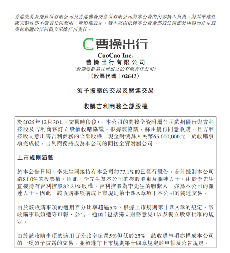 12月30日,曹操出行宣布两项重要战略收购:收购蔚星科技有限公司(下称“耀出行”)100%股权;拟收购浙江吉利商务服务有限公司(下称“吉利商旅”)100%股权。待两项收购事项分别完成后,耀出行、吉利商旅将成为曹操出行的全资附属公司。此举将进一步升级曹操出行产品矩阵,打造一站式科技出行平台。曹操出行自2016年启动企业客户服务,截至2024年12月31日,已累计服务超过1.35万家企业。耀出行拥有成熟的企业会议活动、企业日常用车及高端网约车业务,吉利商旅可提供全流程差旅解决方案以及会议及活动的全案服务。完成整合后,耀出行、吉利商旅将充分借助曹操出行的平台势能,持续为现有客户提供优质服务。曹操出行