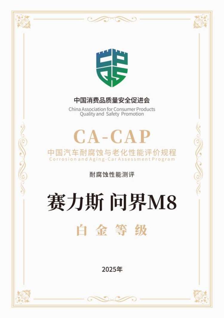 12月19日,中国汽车耐腐蚀与老化性能评价(CA-CAP)测评结果正式揭晓,问界M8增程MAX六座版凭借在外观、功能和划痕评价三大方面的亮眼表现,在多款热门参评车型中脱颖而出,荣获整车耐腐蚀性能测评“白金等级”证书,并以97.5的综合评分摘得最高五星评级。该成绩不仅是本届测评的最高得分,更刷新了CA-CAP历史认证车型最高分纪录。CA-CAP是在中国消费品质量安全促进会的指导下,由海南热带汽车试验有限公司牵头开展的一项面向行业的权威测评,自2022年至2025年已连续开展四届,累计认证25款车型,涉及22个汽车品牌。此次问界M8获奖,充分印证了其在复杂环境下卓越的耐腐蚀性能。作为家庭智慧旗舰S