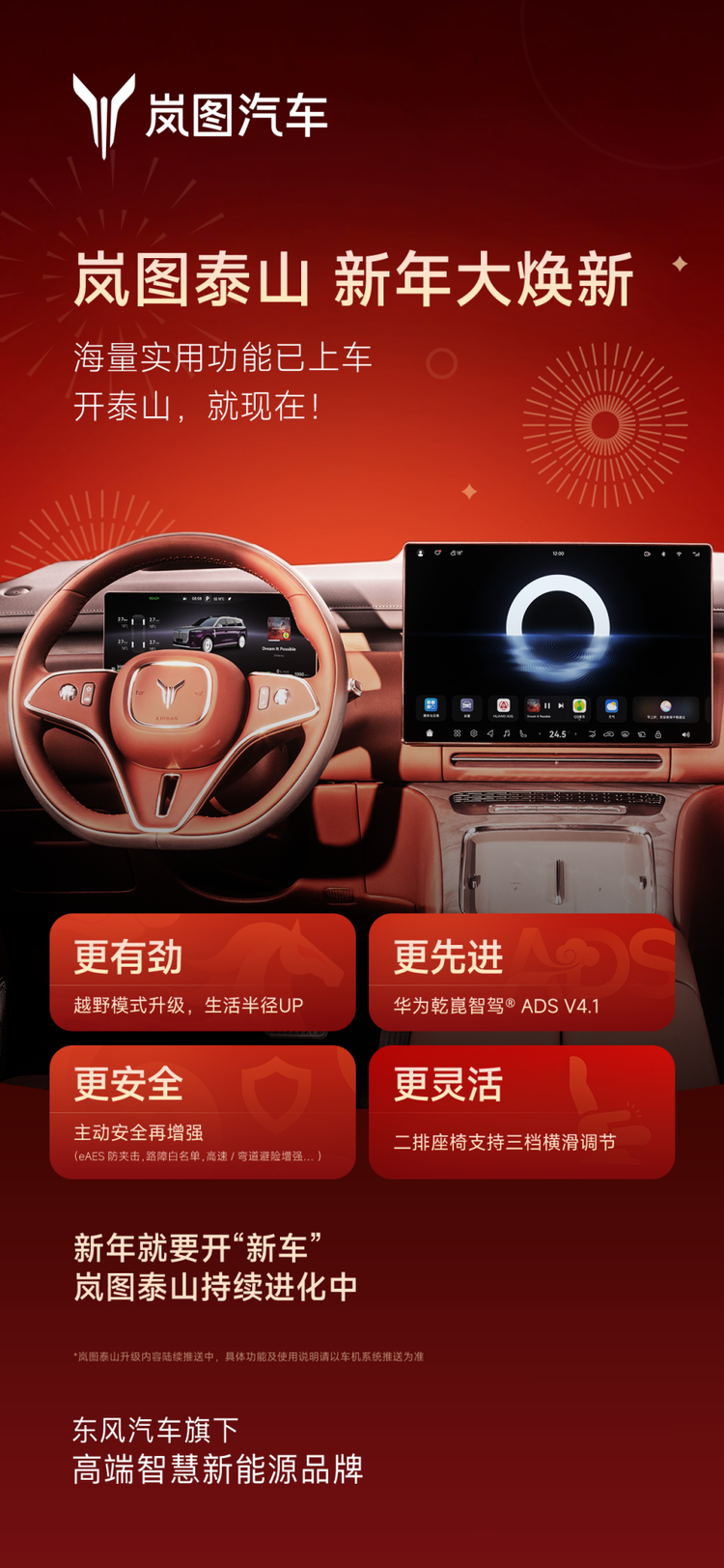 2026年2月4日,岚图汽车向岚图泰山车主正式推送首次重大OTA升级!此次升级以华为乾崑智驾ADS 4.1为核心,覆盖智能座舱、辅助驾驶、越野性能三大维度,用“商务+越野”双场景差异化优势,直接改写高端商务SUV的价值规则。作为新时代旗舰大六座SUV,岚图泰山这次整车OTA不仅是产品力的全面进化,更精准戳中市场痛点——打破高端商务SUV“城市代步”的刻板印象,以华为顶级智能辅助驾驶筑牢全场景安全防线,用同级人无我有的越野基因突破品类局限,在高端智能汽车赛道亮出硬核技术底气。华为乾崑智驾ADS 4.1满血推送 华系智驾“卷王”诞生作为首批全量推送华为乾崑智驾ADS 4.1的车型,岚图泰山直接把华