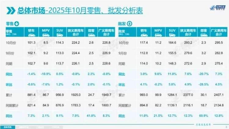 乘联会2025年10月《全国乘用车市场分析》如期而至,在“金九银十”的助力下,10月汽车市场一片大好,全国共卖出乘用车224.2万台,今年累计卖出新车1925万台,同比增长7.9%。宏观来看,10月份乘用车销量224.2万,相比于9月份的224.4万台,并没有太大差距。在这224.2万台的新车里,SUV是销量主力,共卖出114.3万台,轿车卖出101.3万台,MPV卖出8.5万台。今年前10个月累计销量1925万台,2月份的138.4万台是销量低谷,6月份是上半年销量最高的月份,达到208.5万台,进入7月份小低谷之后,8/9/10三个月更是实现三连涨,9月和10月也是今年目前销量最高的月份,