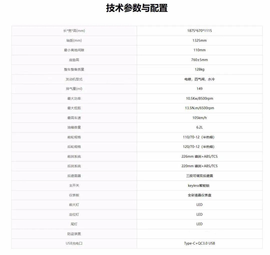 其他方面这款车依旧配备了6.2L底置油箱,减震系统前正立式减震,后双筒减震器预载可调,制动系统则为前后碟刹标配双通道ABS。车把左下方配备Type-C+USB3.0双充电接口,座桶下能够放下一顶小号全盔或大部分四分之三头盔,这些和FIDDLE 4基本相同。