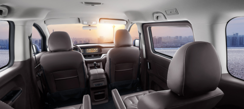 进入王牌M7的内部空间,首先让人颇感惊艳的就是其轻奢风的内饰。王牌M7采用通体环抱式驾舱,10.25英寸智能双联屏更是同级少有的越级配置,还贴心的设计了遮阳板,方便驾驶人员在阳光下也能看清屏幕内容。车内多功能方向盘、空调出风口、门把手等位置均有镀铬装饰,彰显不俗品质。而中控台下方更有一条镀铬装饰条贯穿两端,再加上多处软包设计和座椅的红色缝线处理,令车内空间品质感油然而生。王牌M7的车内空间也是其亮点之一,车身尺寸为4880/5240*1870*1950mm,轴距有2800/3200mm两种,除前排驾驶席外,后排为用户留出了最大6.1m³的实用空间,还有纯平地板和支持整体翻倒的座椅,可以根据运输需求,灵活的增加更大的载物空间。这样的空间轻松满足各种场景需求,如日常代步出行、假期全家旅游、商务接待、客货运等。可以说王牌M7是真正的创富、休旅好帮手。