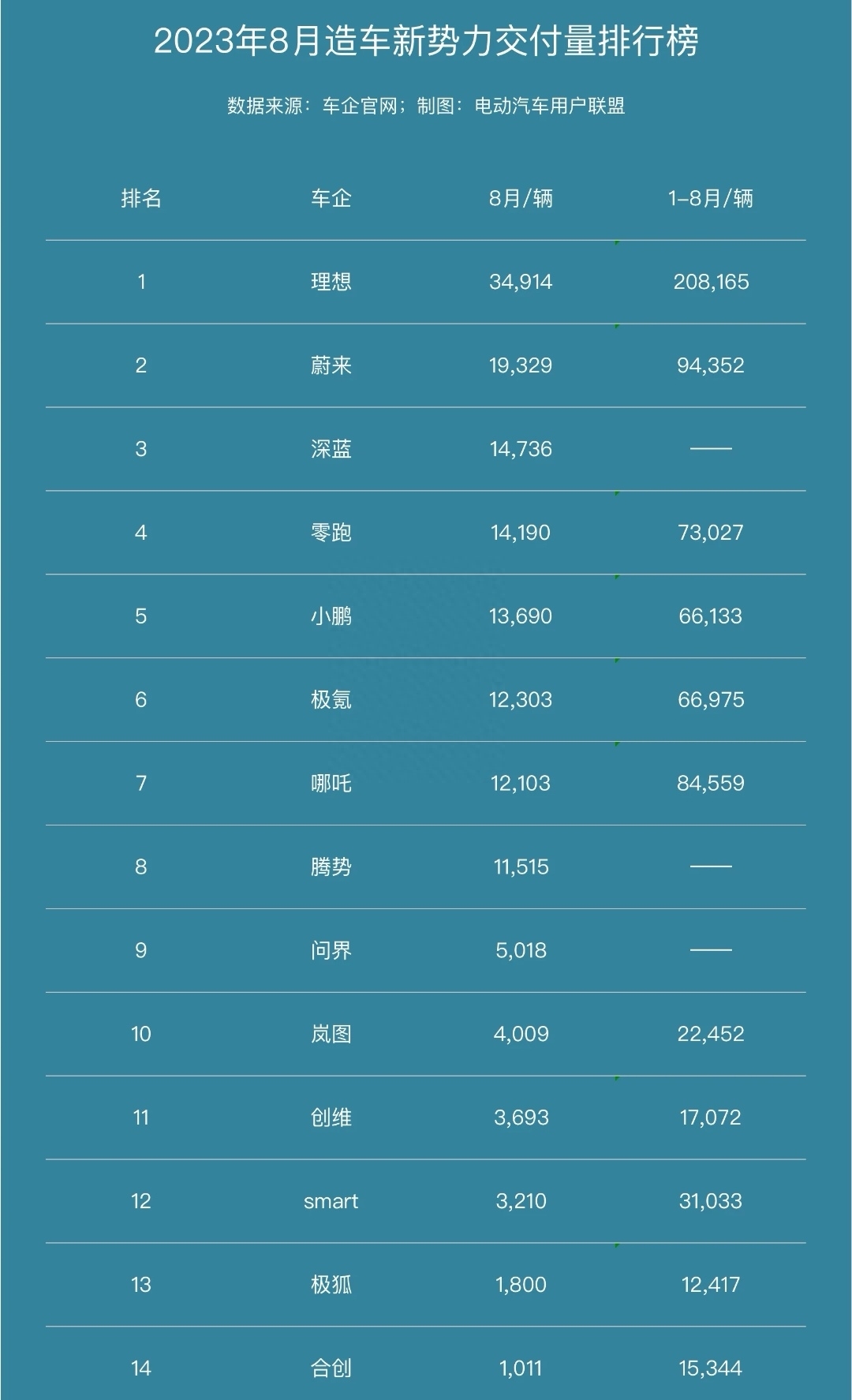 值得一提的是,排在第10名的岚图汽车8月销量4009辆,同比增长65%,环比增长18%,创下单月销量最高纪录。