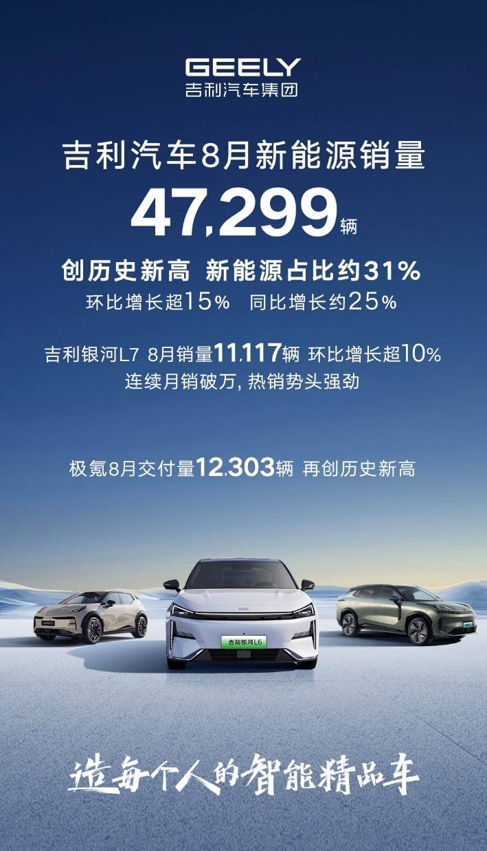 8月,新能源(含吉利、领克、极氪、睿蓝)销量47299辆,同比增长超26%,环比增长超15%,创下历史最好新能源销量成绩;新能源占比约31%。