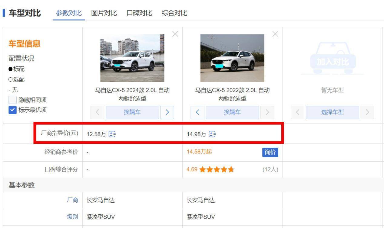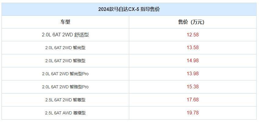 值得一提的是,此前在售的2022款CX-5车型售价在14.98-21.08万元区间,所以这么来看的话,等于说新的2024款CX-5车型起售价在2022款车型的基础上官降了2.4万元。由此也就不得不说,马自达这回总算是在价格上“低头”了?