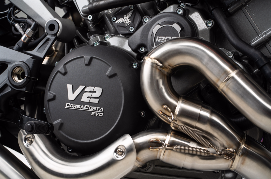 这款车采用1200 CorsaCorta EVO发动机,经过重新设计开发,保留了87°夹角的设计,实际排量1187mL,最大功率为91kW,且符合欧五排放标准。为了让这辆车更好骑,该车配有四种驾驶模式选择,且动力模式下会着重在更强大的扭矩输出。而排气系统也做了精心的布局,环绕在发动机上。