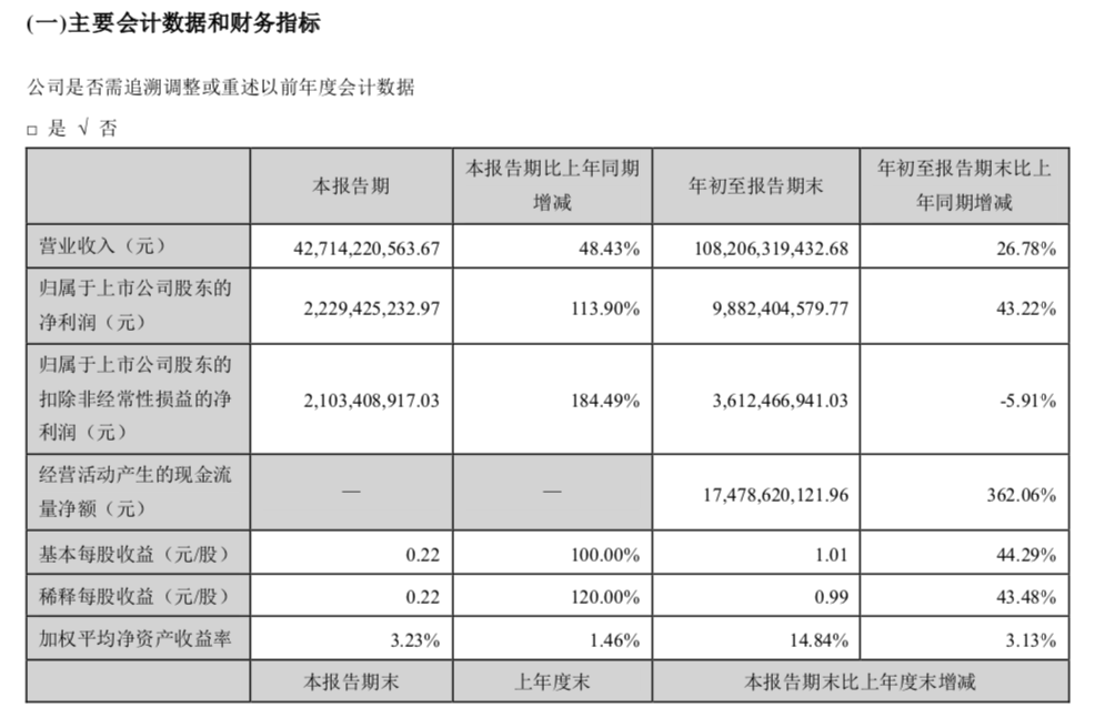 其中,第三季度长安汽车实现营业收入427.14亿元,同比增长48.43%;归属于上市公司股东的净利润22.29亿元,同比增长113.90%。归属于上市公司股东的扣除非经常性损益的净利润21.03亿元 ,同比增长184.49%。