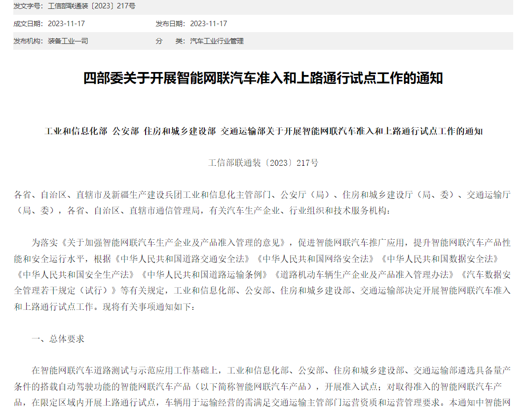 11月17日,《工业和信息化部 公安部 住房和城乡建设部 交通运输部关于开展智能网联汽车准入和上路通行试点工作的通知》(以下简称《通知》)正式印发,并在工信部官网上公布。通知中,四部委决定遴选具备量产条件的搭载自动驾驶功能的智能网联汽车产品,开展准入试点,并对取得准入的智能网联汽车产品,在限定区域内开展上路通行试点。