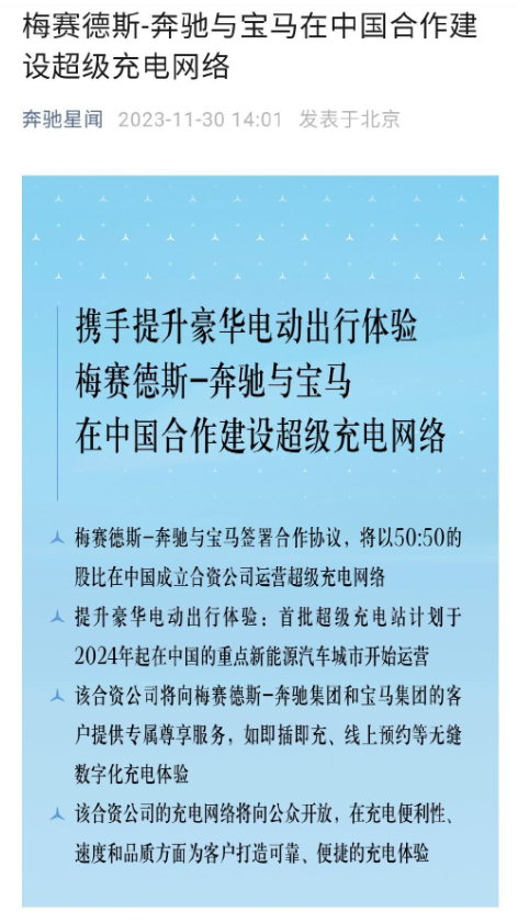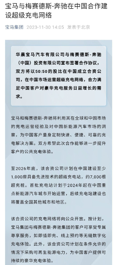 【EV视界报道】11月30日,梅赛德斯-奔驰(中国)投资有限公司与华晨宝马汽车有限公司宣布签署合作协议,双方将以50:50的股比在中国成立合资公司,在中国市场运营超级充电网络,合力满足中国客户对豪华充电服务日益增长的需求。