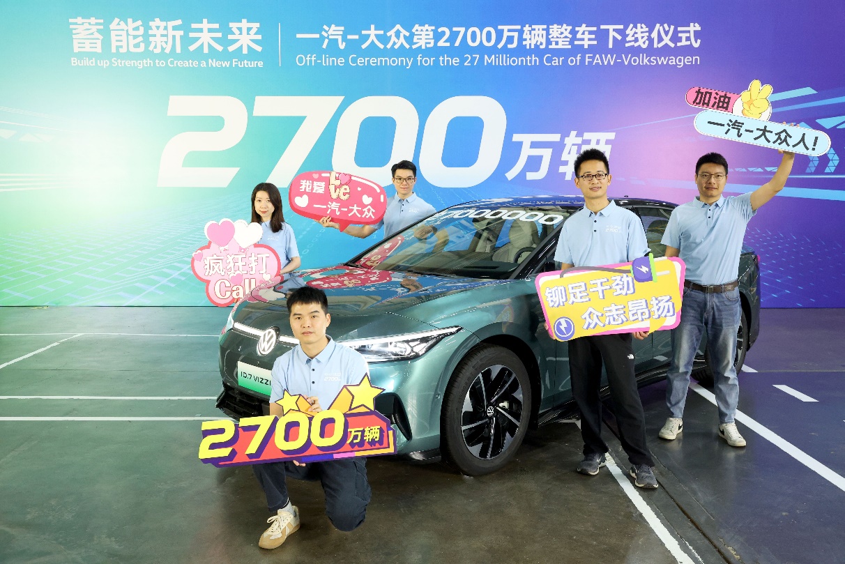 12月1日,一汽-大众第2700万辆整车——ID.7 VIZZION在佛山MEB智慧工厂下线。继去年10月24日第2500万辆整车下线之后,一汽-大众再次刷新纪录,站在了累计生产整车2700万辆的崭新台阶,总用时32年零10个月。活动现场,中国一汽和大众汽车集团(中国)相关领导,一汽-大众经管会成员,员工代表等共同见证了这一重要的里程碑时刻。