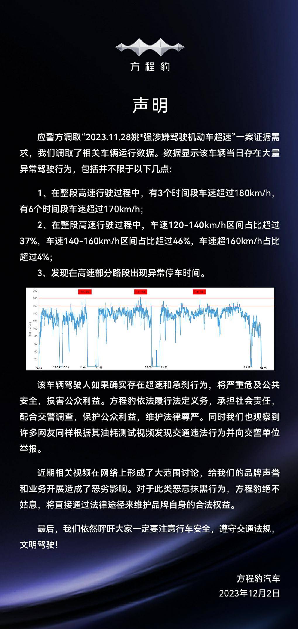 同时,方程豹在《声明》中还表示,该车辆驾驶人如果确实存在超速和急刹行为,将严重危及公共安全,损害公众利益。