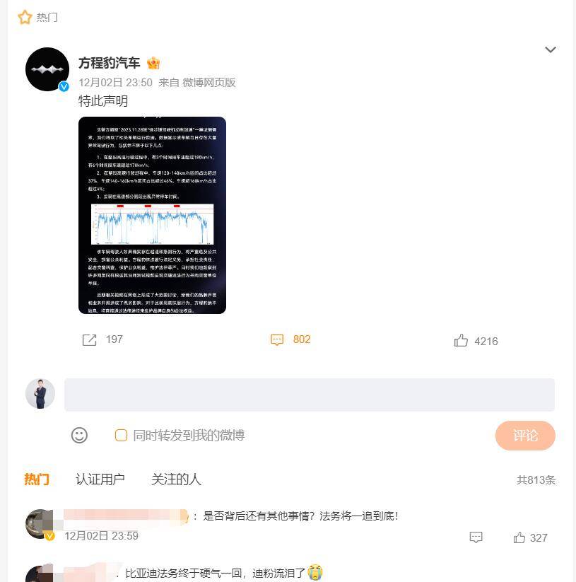“近期相关视频在网络上形成了大范围讨论,给我们的品牌声誉和业务开展造成了恶劣的影响。对于此类恶意抹黑行为,方程豹绝不姑息,将直接通过法律途径来维护品牌自身的合法权益”12月2日,针对“某博主测豹5高速油耗18升”引起了网络的广泛关注,方程豹在回应中如是表示。