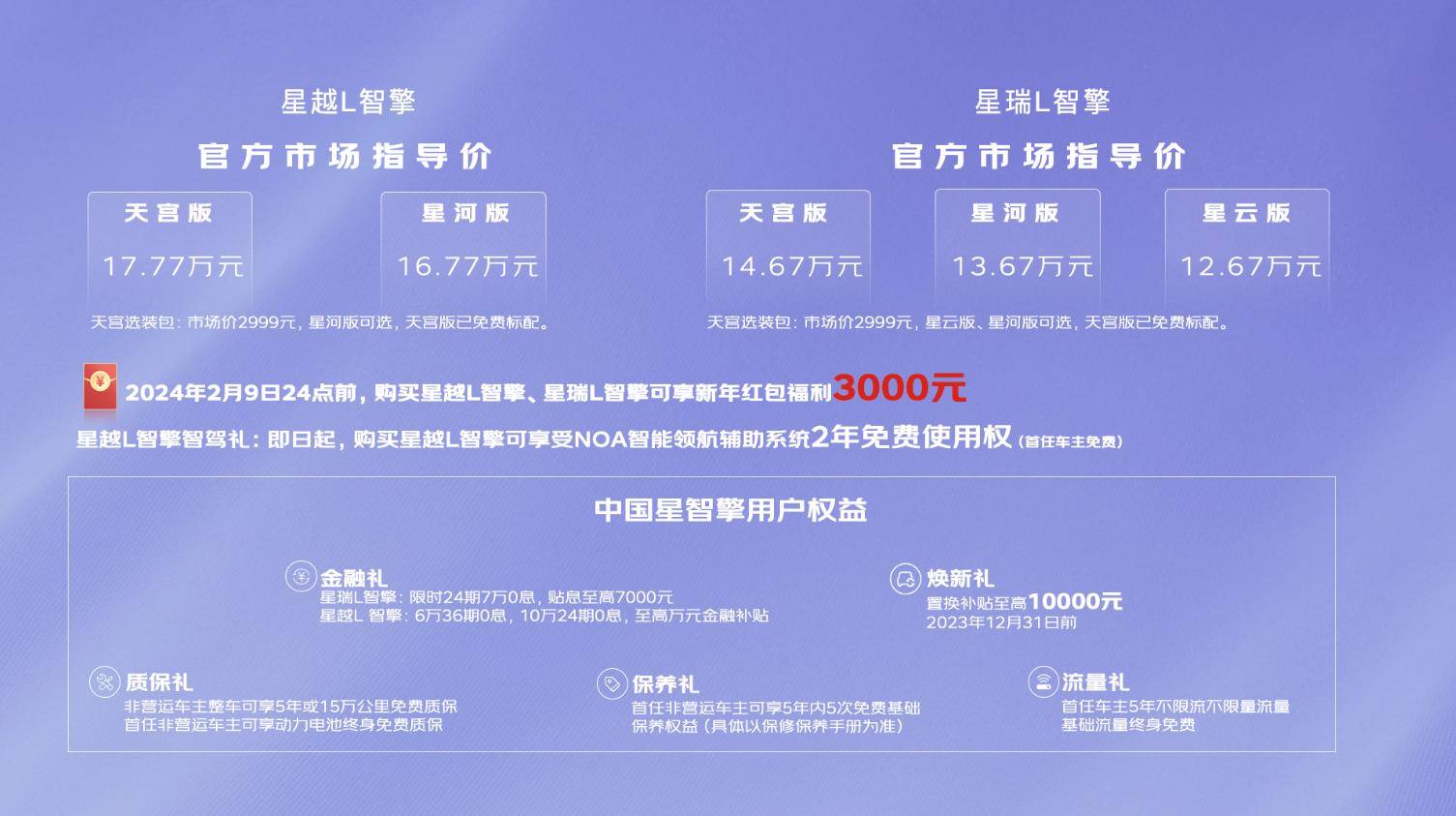 12月3日,吉利“中国星·文旅中国探索计划”河南站于郑州开启,中国星携手河南卫视创新打造一场融合中国文化与现代科技、舞蹈艺术与汽车工业于一体的“鸿鹄志·中国文化科技奇妙夜暨中国星智能双擎上市发布会”。在发布会上,中国星智擎双旗舰正式上市,星瑞L智擎推出星云版、星河版和天宫版三个版型,官方指导价为12.67万元—14.67万元;星越L智擎推出星河版和天宫版两个版型,官方指导价为16.77万元—17.77万元。同时,在2024年2月9日24点前,购买中国星智擎车型,即可享受上市购车新年红包福利3000元;新年红包补贴后,星瑞L智擎限时新年红包价为12.37万元—14.37万元,星越L智擎限时新年红包价为16.47万元—17.47万元。
