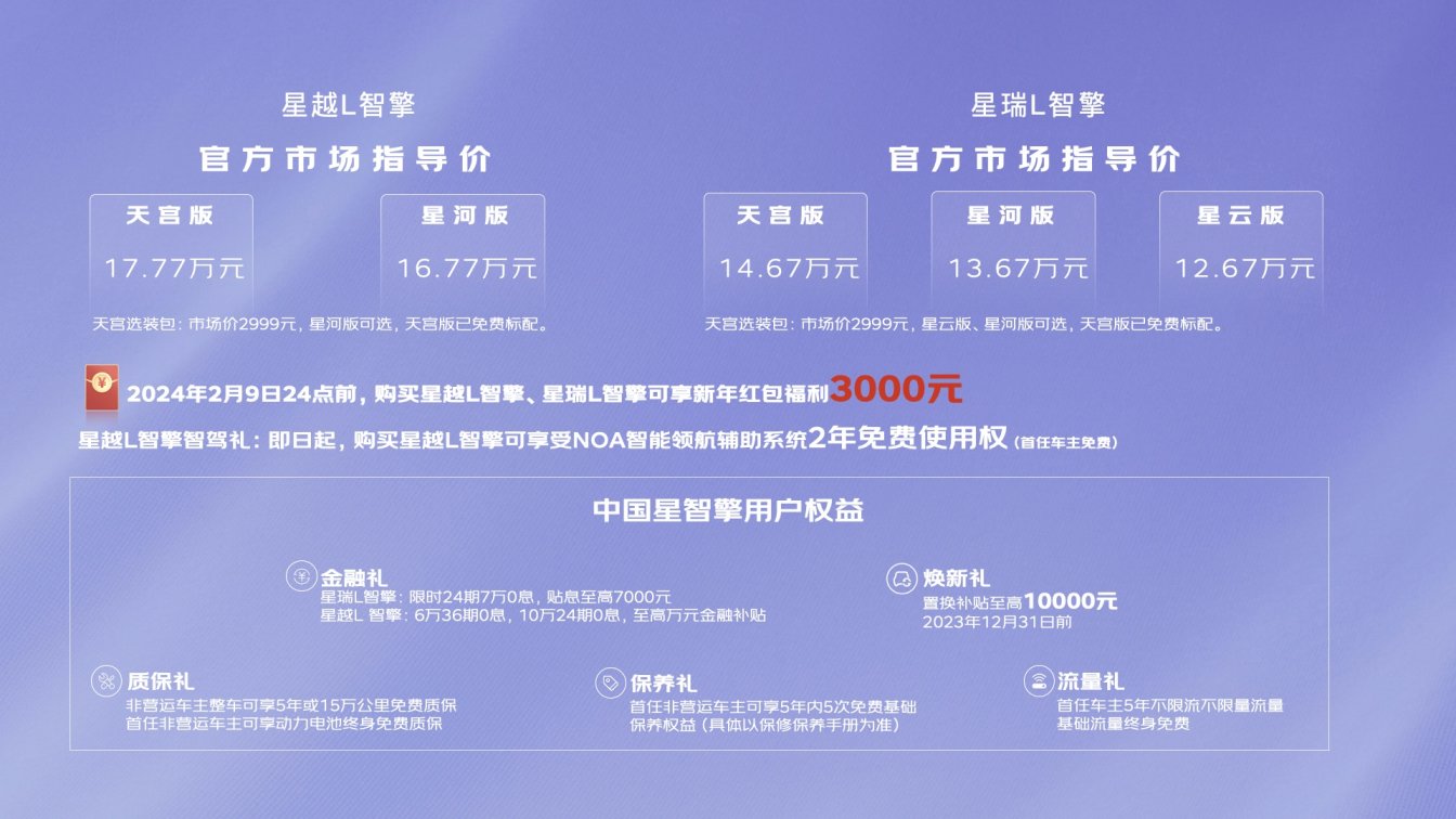 2023年12月3日,吉利“中国星·文旅中国探索计划”河南站于郑州开启,中国星携手河南卫视创新打造一场融合中国文化与现代科技、舞蹈艺术与汽车工业于一体的“鸿鹄志·中国文化科技奇妙夜暨中国星智能双擎上市发布会”。在发布会上,中国星智擎双旗舰正式上市,星瑞L智擎推出星云版、星河版和天宫版三个版型,官方指导价为12.67万元—14.67万元;星越L智擎推出星河版和天宫版两个版型,官方指导价为16.77万元—17.77万元。同时,在2024年2月9日24点前,购买中国星智擎车型,即可享受上市购车新年红包福利3000元;新年红包补贴后,星瑞L智擎限时新年红包价为12.37万元—14.37万元,星越L智擎限时新年红包价为16.47万元—17.47万元。
