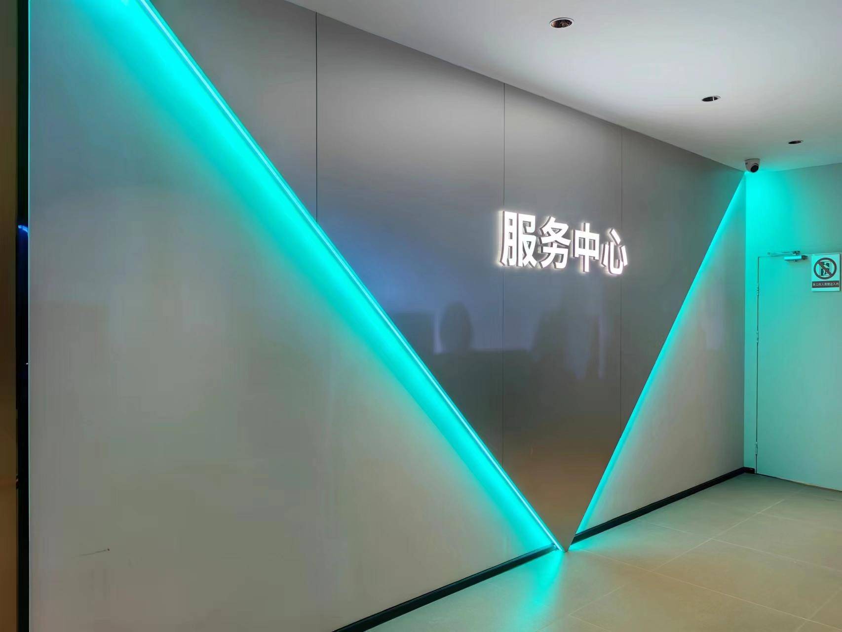店内的灯光多以蓝色线条来装饰,跟门店外观相呼应,比如这个“妖艳”的服务中心,不仅使用了倒三角的造型,而且内置蓝色背景灯——让一面平平无奇的墙壁,瞬间就立体生动了起来。时尚,有时候就是那画龙点睛的一笔。
