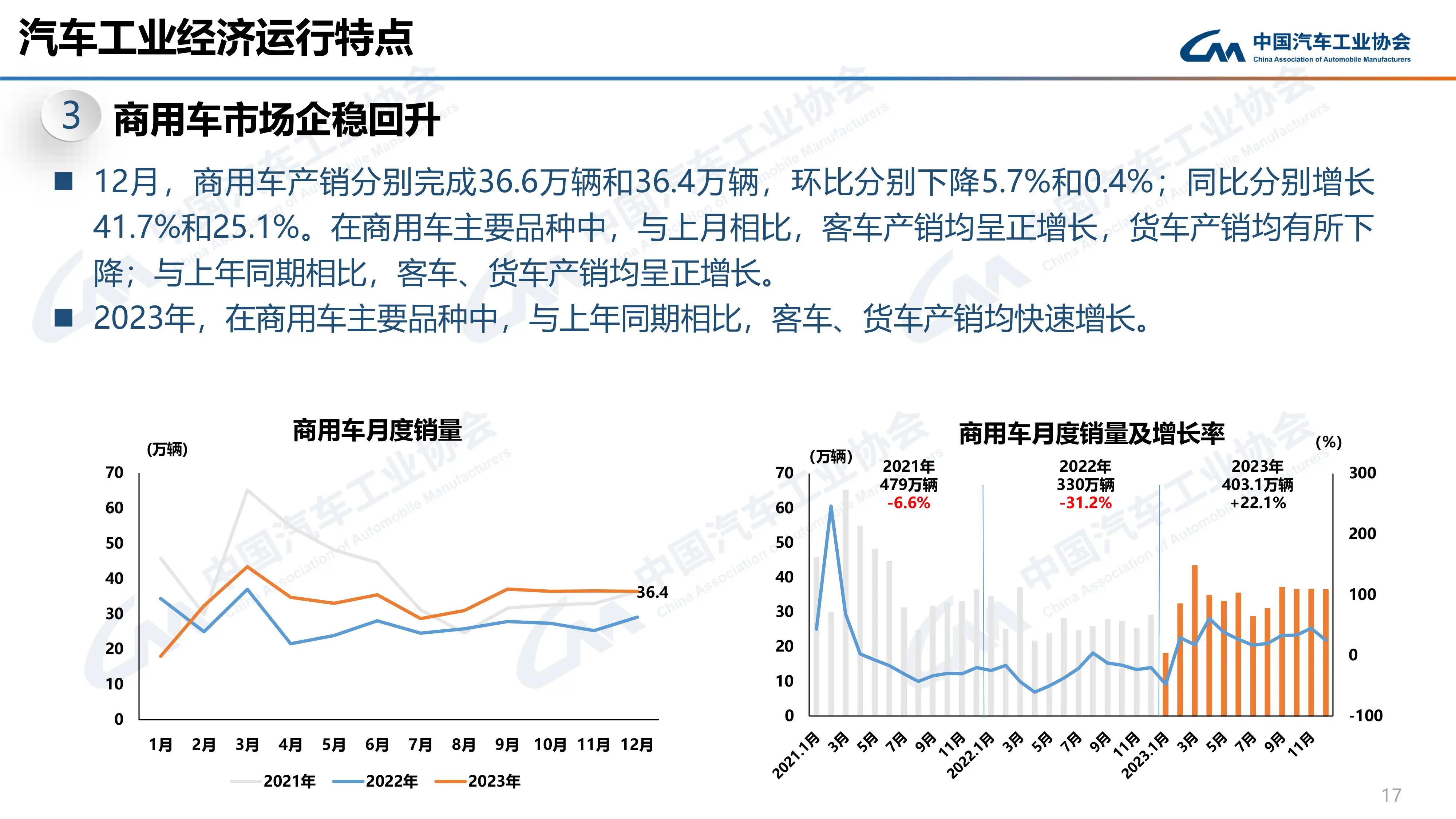商用车作为生产资料,历来都是经济的“风向标”。自去年2月开始,商用车市场持续回暖,全年也仅有1月和12月同比下滑。2023年,商用车市场销量增长22.1%,超过乘用车市场10.6%的增幅,以及整体汽车市场12%的增幅。